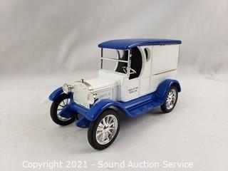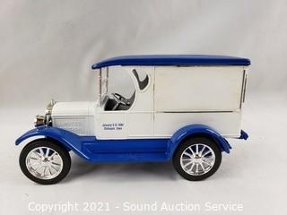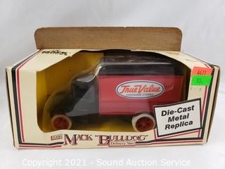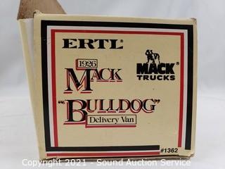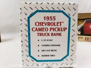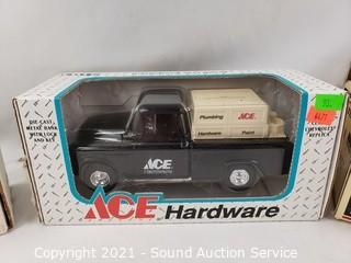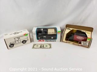 Lot Details: 2 are coin banks. Includes 1923 1/2 Ton Truck, Ertl 1926 Mack Bulldog Delivery Van and Ace Hardware 1955 Chevrolet Cameo Pickup Truck. All in original packaging.