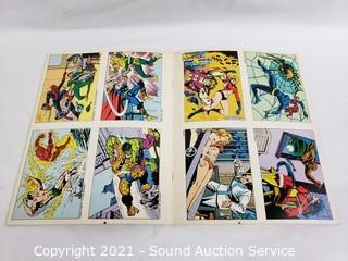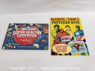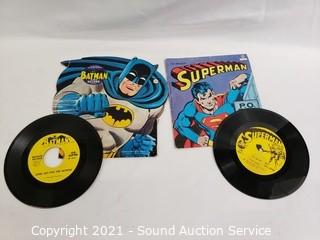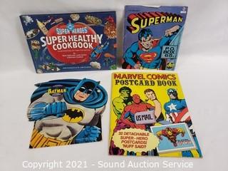 Lot Details: Batman & Superman 45 RPM record albums, Super Heroes cookbook, & Marvel Comics postcard book.