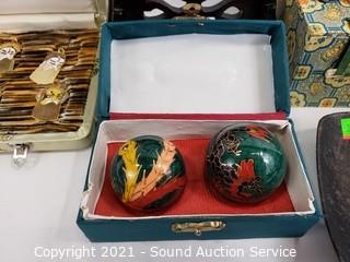 Lot Details: Peking Jewelry pendants, Pakistan copper fairy light, embroidered bird art, Baoding balls, carved Jade Foo Dogs w/stand & box, Turquoise & Jasper set hand crafted tin mask.