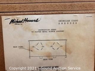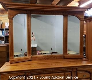 Lot Details: "Georgian Court" style, tri-fold mirror, carved accents, brass drawer pulls. In excellent condition. 33" x 70" x 20" with 44.5" x 65.5" mirror. Matches the next lot.