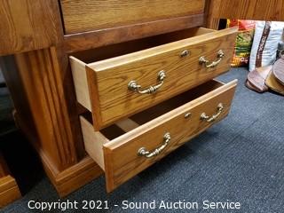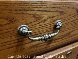Lot Details: 3 drawers, top drawer is sectioned, single adjustable shelf and clothes rod in the upper portion, brass pulls and accents, mirror on the left door. Overall excellent condition, 70.5" x 40" x 25". Matches the previous lot.