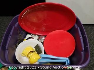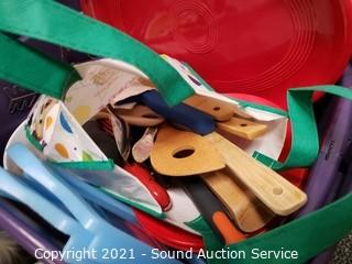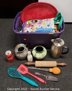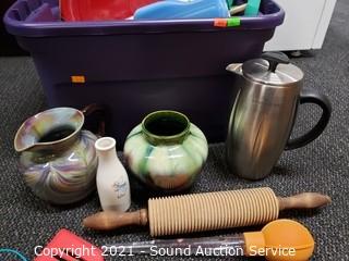 Lot Details: Rolling pin, pitchers, Starbucks percolator, turkey baster, utensils and more.