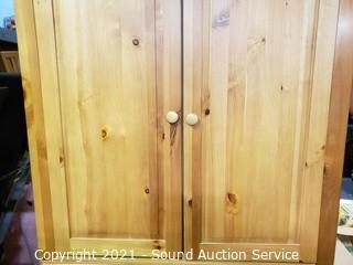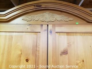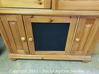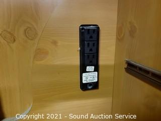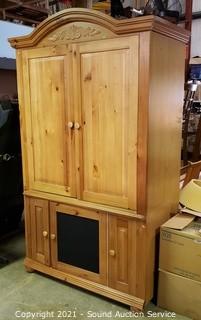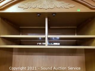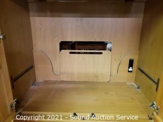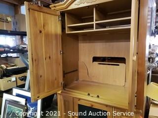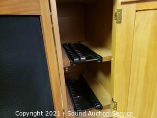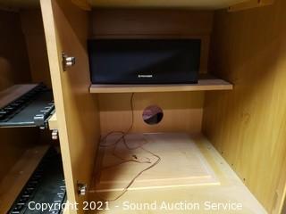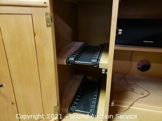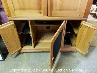 Lot Details: Middle lower door has mesh so can store speakers, comes with a Pioneer center speaker. Pullout DVD racks. Built in power supply. Fits a 33" H x 39" W TV. Overall 86" H x 48" W x 26" D.