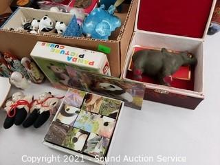 Lot Details: Scrimshaw Goose Mounted to Horn, Ironwood Carved Figure, Unique Carved Jade Handle Spoon, Ceramic Figure Decanter, Yunnan University Medallion, Capitol Hotel Medallion, Panda Figures & Picture Cubes & More.
