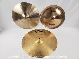 Lot Details: 14" to 18" bronze & brass cymbals Zildjian, Pearl CX300. 14" 16" & 23" heads?.