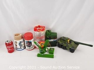 Lot Details: Tank Action Figure, Thermoses, Personal Hygiene products.