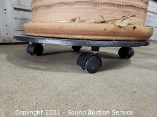 Lot Details: Approx. 5.5ft Tall. not sure what it is, similar to Hawaiian Elf. Nice pottery 13" H x 16" pot with cast metal cart.