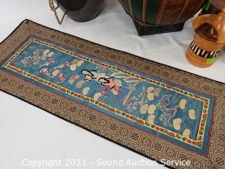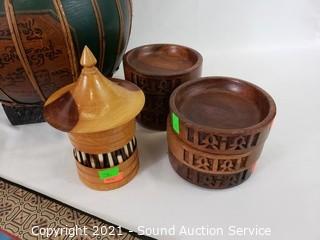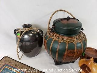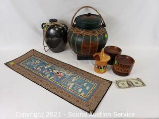 Lot Details: 6 carved wood coasters, carved wood pagoda box, embroidered tapestry, pottery vase & green wood jug (11" H x 10").