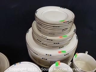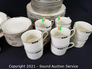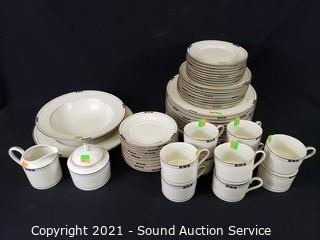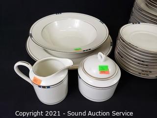 Lot Details: Made in Japan. 10 cups, 10 saucers, 9 snack plates, 8 lunch plates, 10 dinner plates, cream, sugar, 10" bowl, 12" charger.