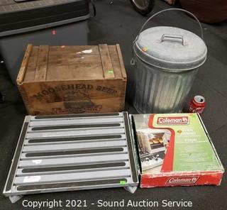 Lot #0295: Galvanized Pail, Camp Stove, Wood Crate & Step