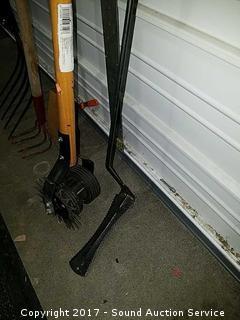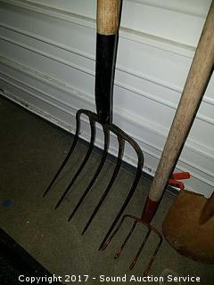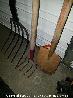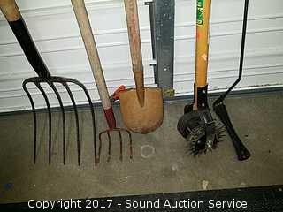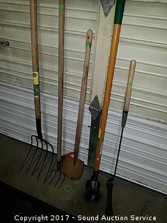 Lot #0211: Edger, Garden Rake, Sickle, Pitchfork & Shovel