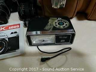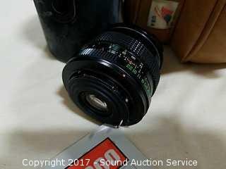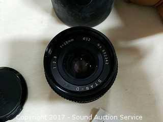 Pentax-M 1:3.5 135mm telephoto lens with case, Star-D 1:2.8 F=22mm 52mm lens, and Vivitar 180 flash, instructions. Comes in Marsand case.