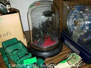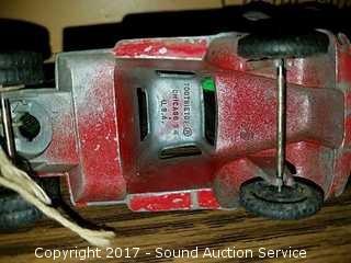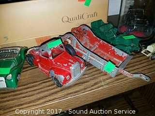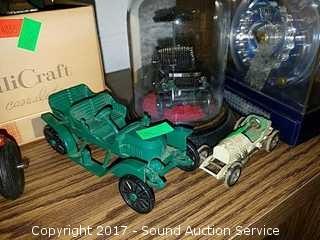 Includes: Tootsie Toy die cast truck and trailer, Revell Stanley Steamer, tin tractor and car, plastic animal figurines, 1901 mercedes, and more.