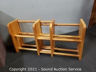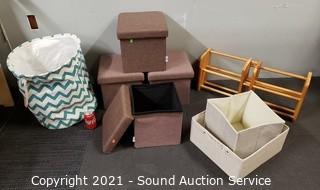 Lot #0270: 6 Storage Totes, Laundry Basket & Wood Rack