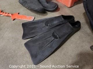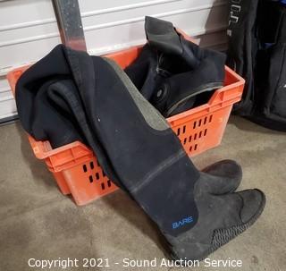 Lot Details: Fins, tank pack, tank, tool & lights. Wetsuits approx. XL. Waders are Carhartt S: M.