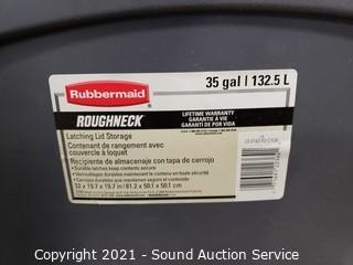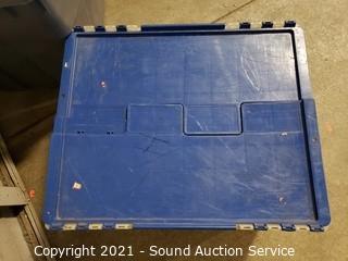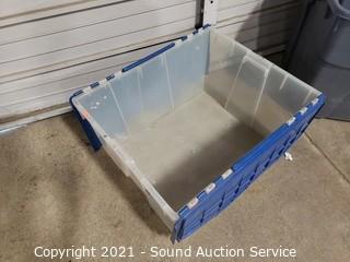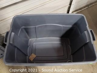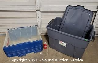 Lot Details: Folding lid tote has a hole. Larger tot is Rubbermaid. 12" H x 23" x 19" & 19" H x 28" W x 18".