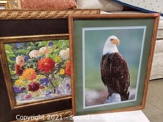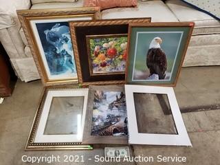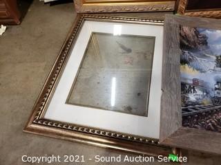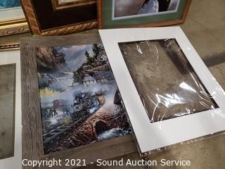 Lot Details: Frame fits 14" x 18". Artwork is 17" x 21 to 16" x 19" artwork. Train, Eagle, Floral & People artwork.