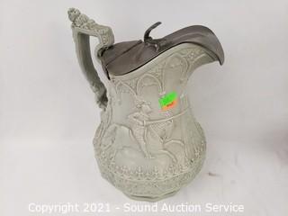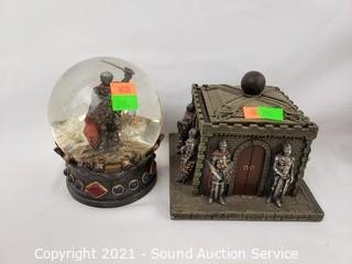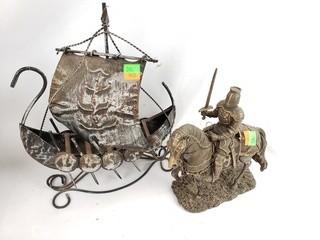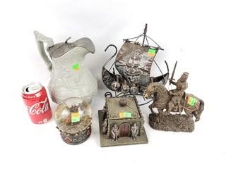 Lot Details: W. Ridgway pitcher, Metal art Viking ship, composite box, mounted knight & water globe.