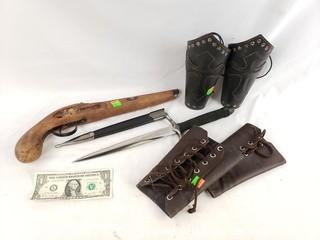 Lot #0242: Leather Arm Guards, Dagger & Decorative Pistol