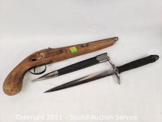 Lot Details: Dagger is 17" long with sheathe, pistol is like a pirate replica, no firing mechanism.