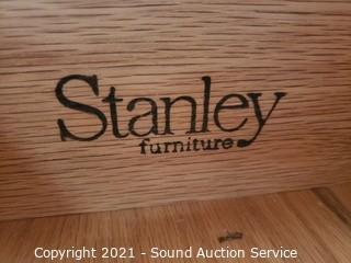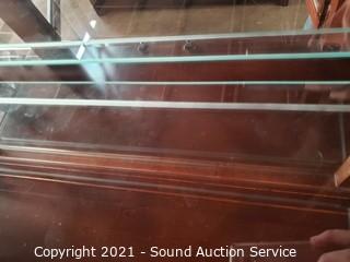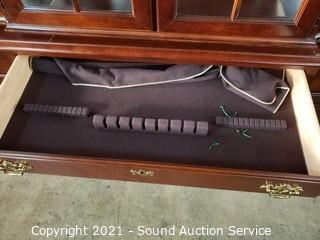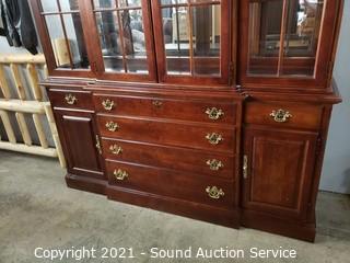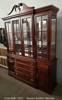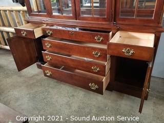 Lot Details: In great condition. 4 drawers. Top drawer is felt lined with flatware insert. Glass shelves with plate grooves. 2pc for easier travel. 89" H x 69" W x 18" D.