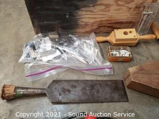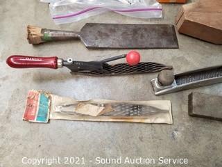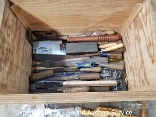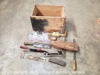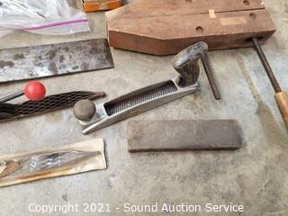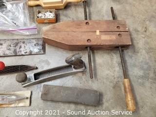 Lot Details: Wood clamp, chisels, files & more. 12" H x 14" x 20".