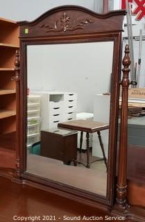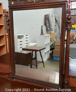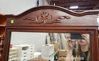 Lot Details: Some wear to the finish. 30" x 47.5" x 19.5" with 35" x 26" mirror topper. Stool is 17.5" x 24" x 15", some minor staining to the fabric. Matches the previous lot.