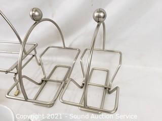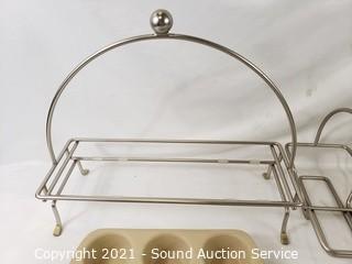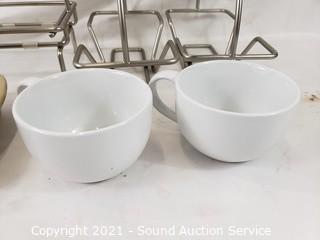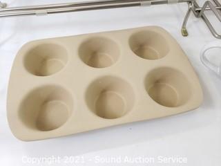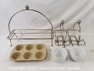 Lot Details: 2 small candy bowls, 2 coffee cups, 6 cup muffin pan, rectangle stand.