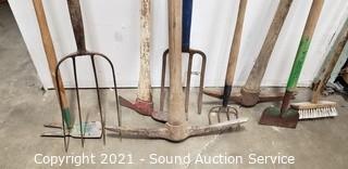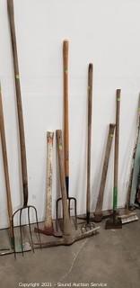 Lot Details: Potato fork, pitch for, pickaxes, mattock, hoe, cultivator.