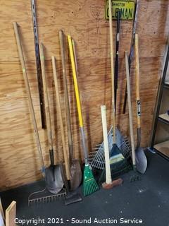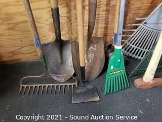Lot Details: Spade shovels, brush rake, leaf rake, hoe, splitting axe & more.