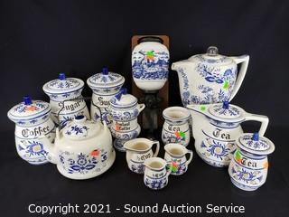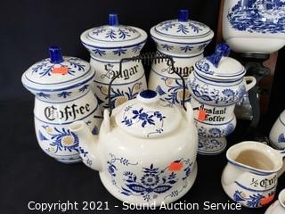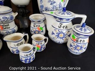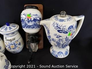 Lot Details: Kitchen canisters, coffee mill, teapot, coffee pot, pitcher & more.