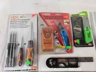 Lot Details: HDX 10pc Interchangeable Precision & Standard Screwdriver Set, Stanley & Husky Folding Utility Knives 1 w/Sheathe, Slide Rule.