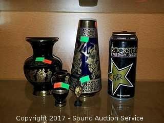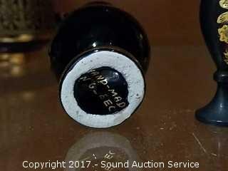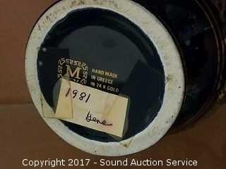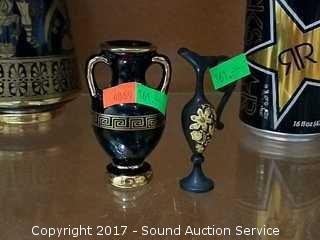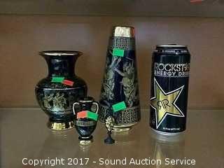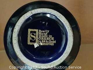 All are handmade in Greece. All are 24k gold overlay. Have a blue and black finish. Also comes with a miniature etched brass pitcher.