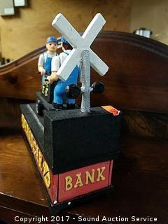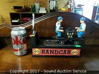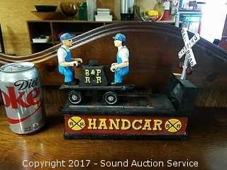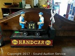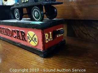 Lot #0206: Railroad Handcar Cast Iron Mechanical Coin Bank