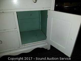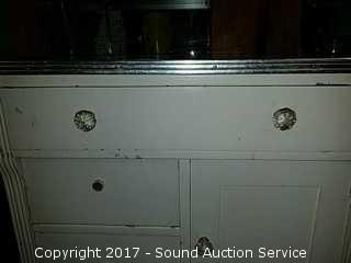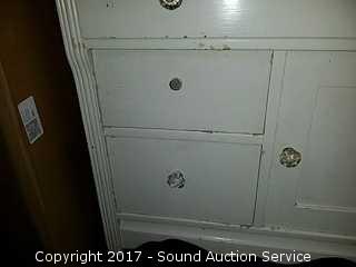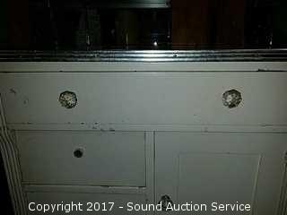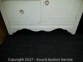 With glass knobs 3 drawers & cabinet. Approx. 28-1/2" tall, 30" wide, 16" deep. Laminate has a crack in the top.