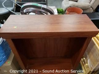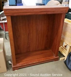 Lot Details: Back is coming free needs reattached, some scuffs. Peg holes for shelves. 40" H x 35" W x 13" D.