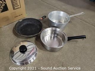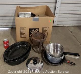 Lot Details: Cast iron 9" skillet / dutch oven lid, 12" & 14" roasting pans, Presto pressure cooker & more.