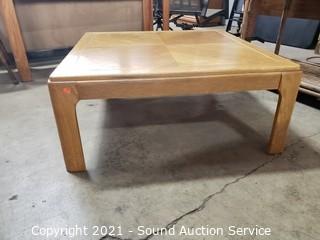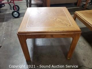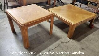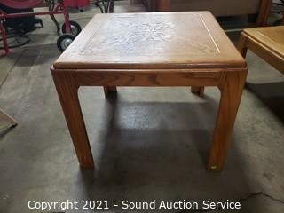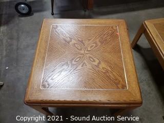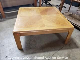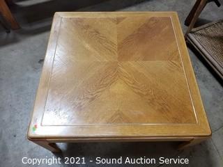 Lot Details: 14" x 35" x 35" coffee table, 21" x 26" x 26" end table. Some minor wear to the finish, overall great condition. Matches the next lot.