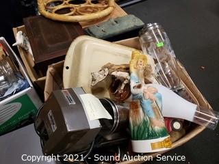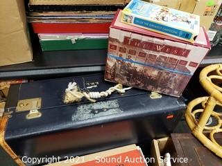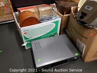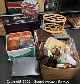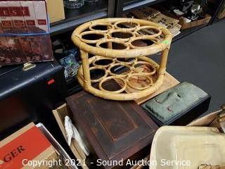 Lot Details: Sharp VHS Player w/Time Life "The West" & Greatest Cartoons tapes, wine rack, suitcase, wood trinket boxes, various decor, vintage decanters, canister & much more.