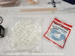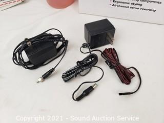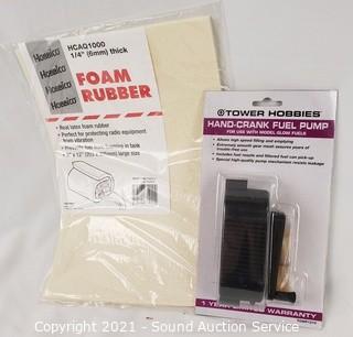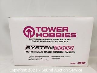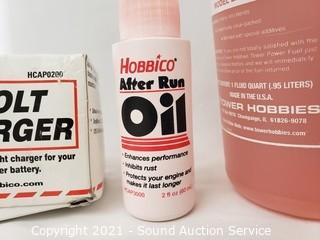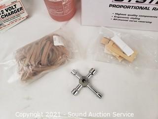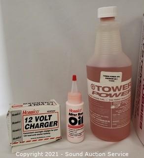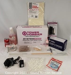 Lot Details: Tower Hobbies System 3000 Proportional Radio Control System. 3 chargers, multi-tool, hand crank fuel pump, rubber-bands, 1 bottle after run oil, 1 bottle model engine fuel, Tower Power 12v starter, small variety of model plane pieces.