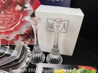 Lot Details: Platters, plates, candleholders & large bowl. Large bowl isn't marked, others are Mikasa.