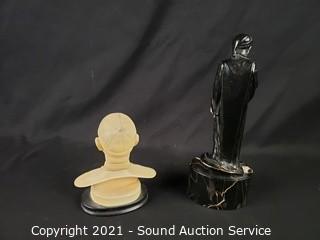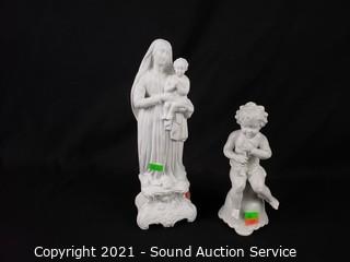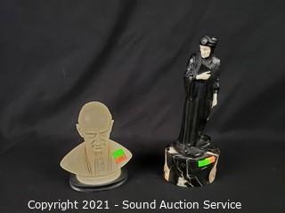 Lot Details: Orlik Germany child 7" H x 3"; Italian S.S. Paolo VI, signed A. Soutun, 6" H x 4.75"; Porcelain bisque Mother & Child, 10.5" H x 3.5"; Bronze & Marble Cast Metal Nun, 10" H x 4" W.