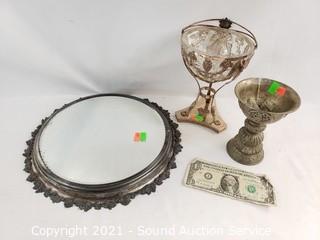 Lot Details: 12" Dia mirrored vanity or display tray, 5.5" to 7" H x 4" to 5" Dia goblet & compote.