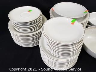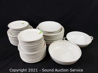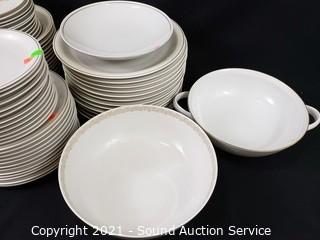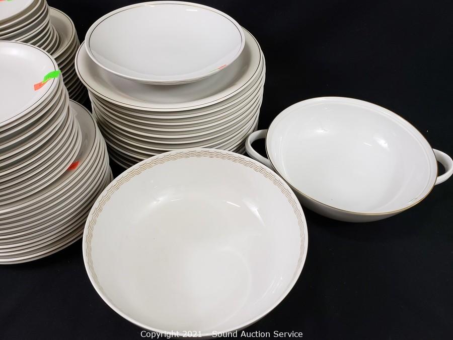 Lot Details: 11 saucers, 12 bowls, 12 dinner plates, 12 snack plates, 12 lunch plates, (2) 9" serving bowls & dish.