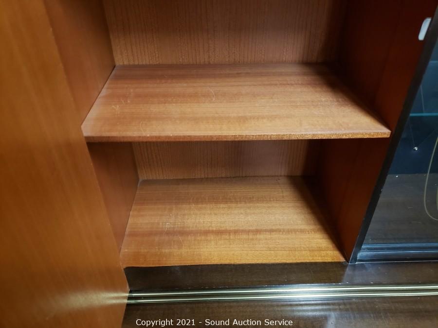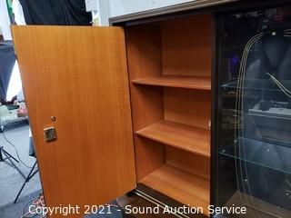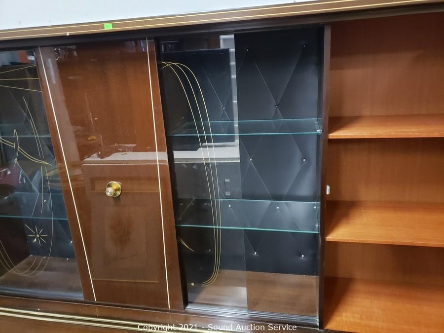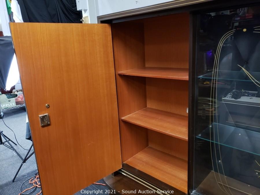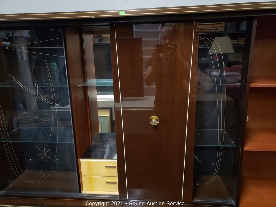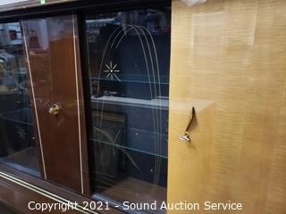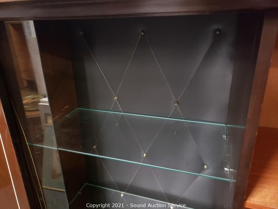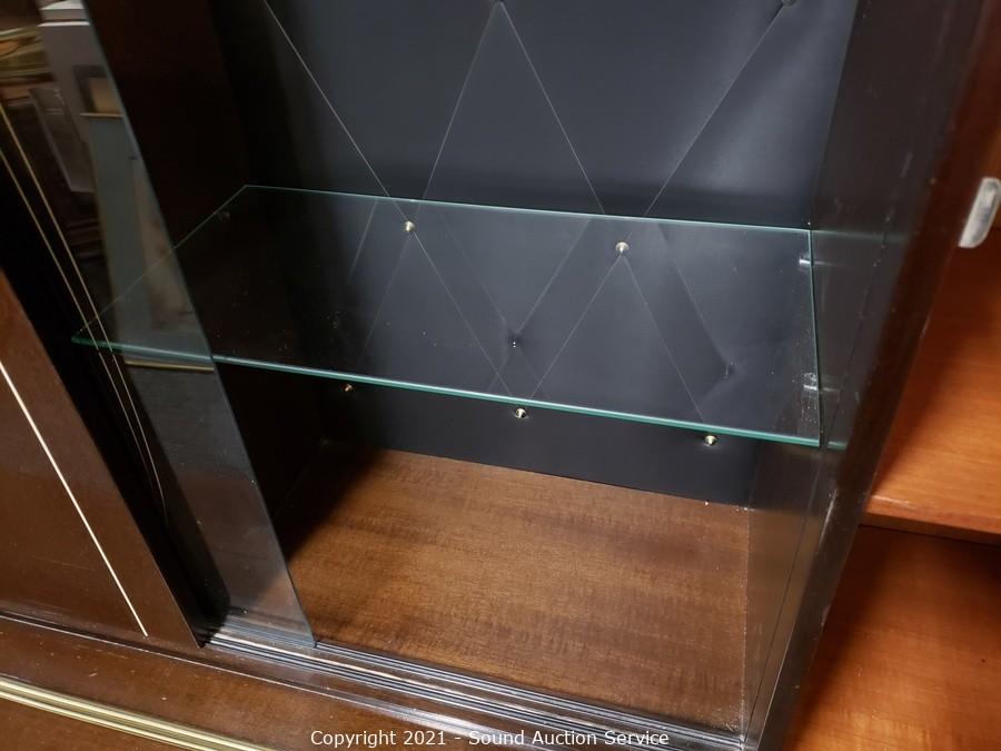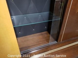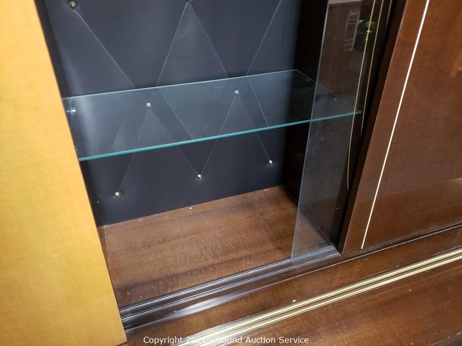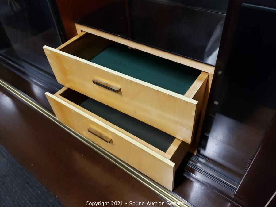 Lot Details: Glass sliding doors, center door slides to reveal a mirror and 2 felt lined drawers, glass shelves, side panels and lower cabinets are locking, come with individual keys. Some minor wear, overall excellent condition. 60.25" x 94" x 21".