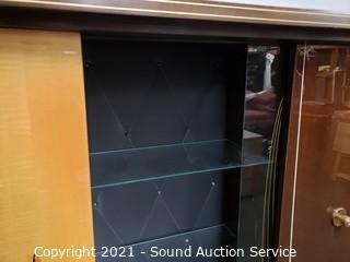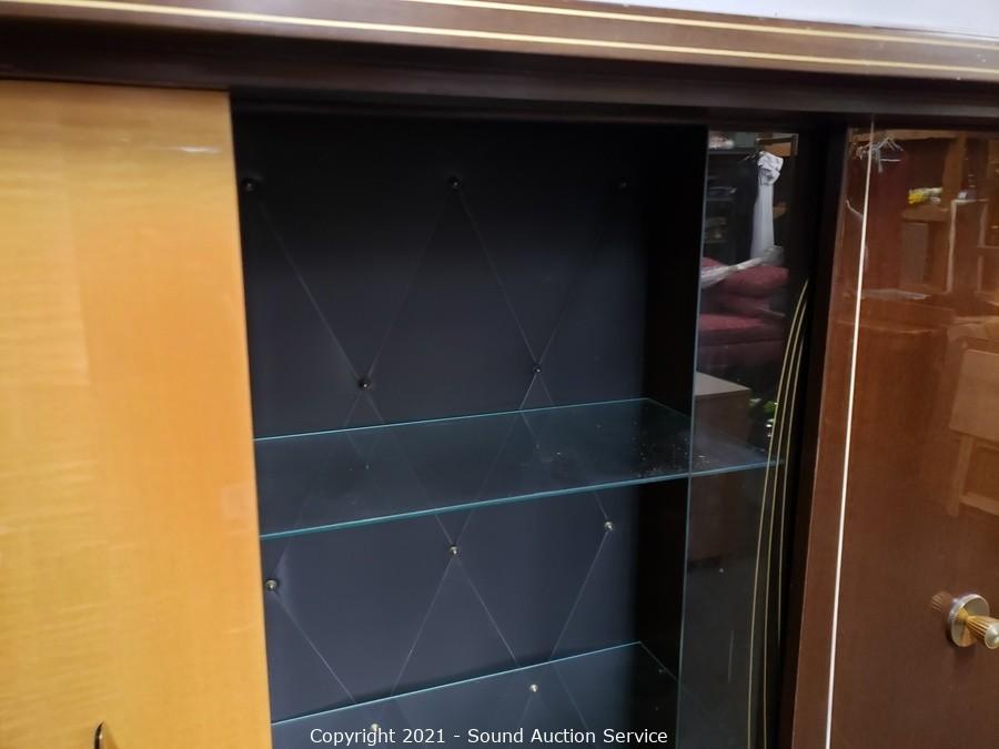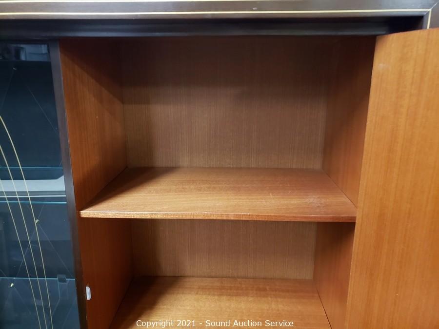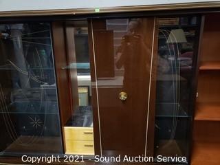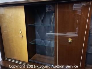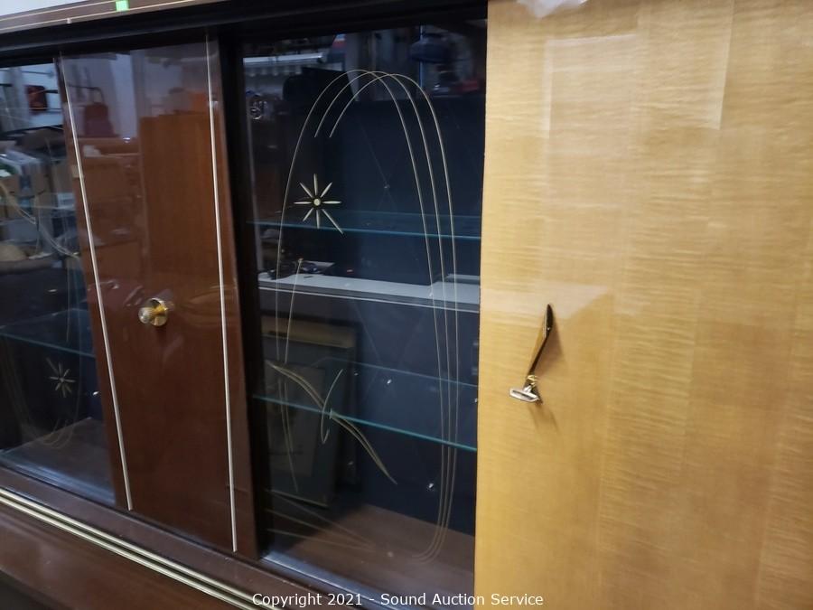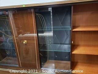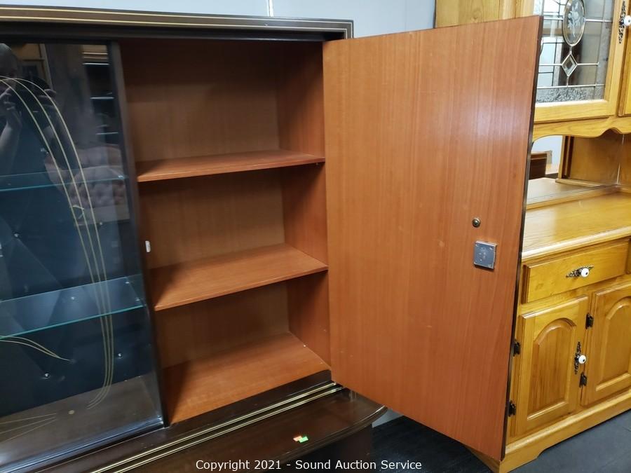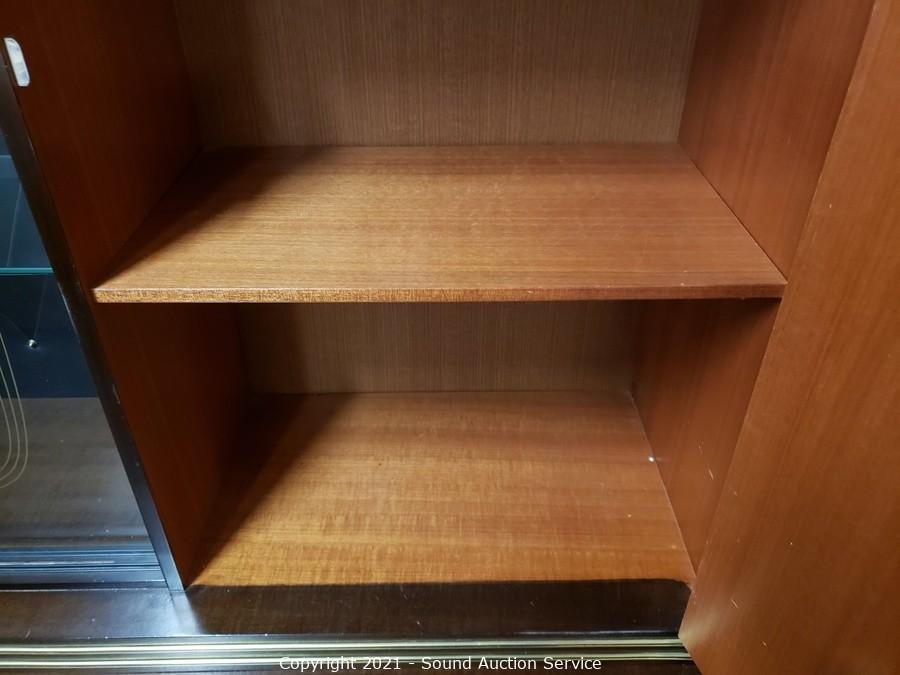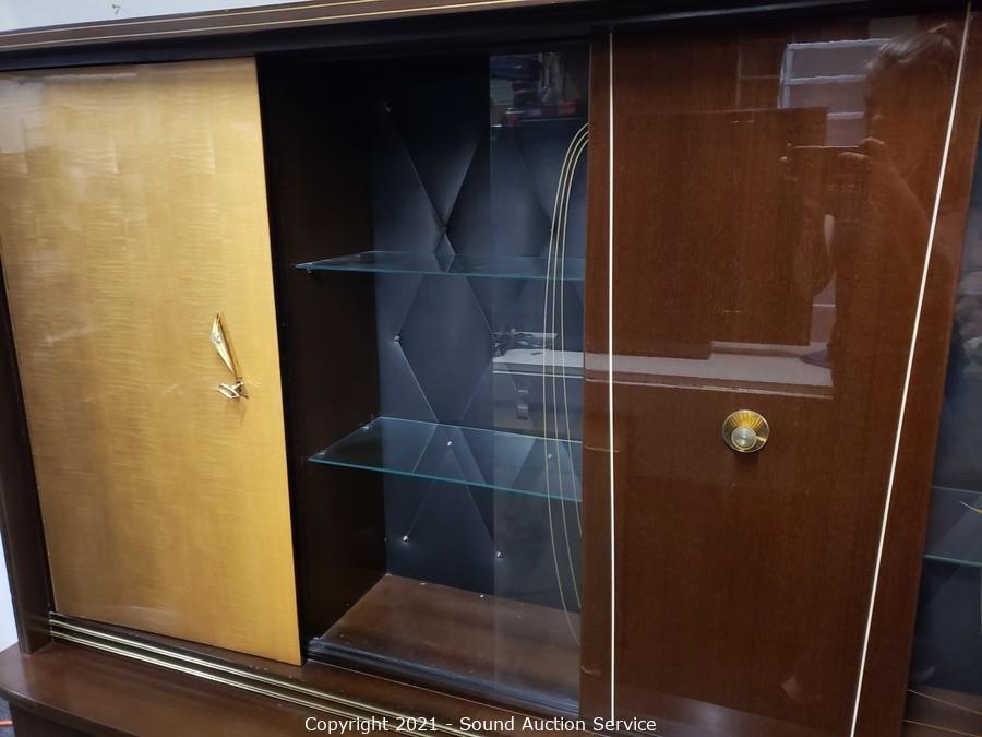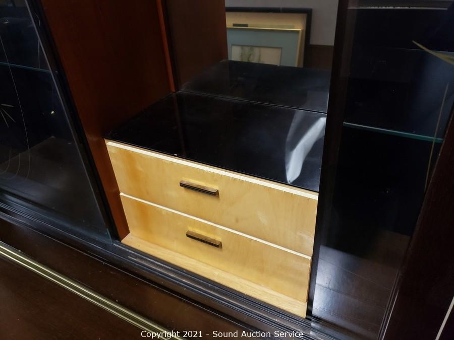 Lot Details: Glass sliding doors, center door slides to reveal a mirror and 2 felt lined drawers, glass shelves, side panels and lower cabinets are locking, come with individual keys. Some minor wear, overall excellent condition. 60.25" x 94" x 21".