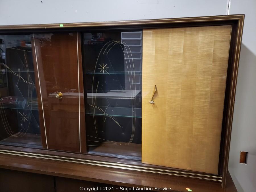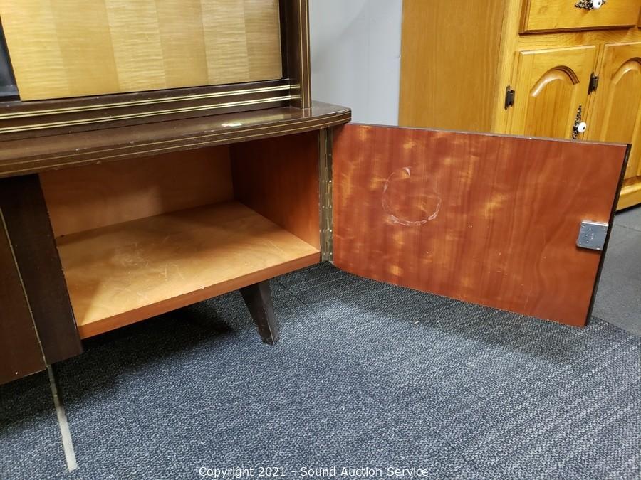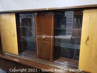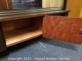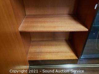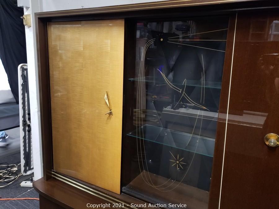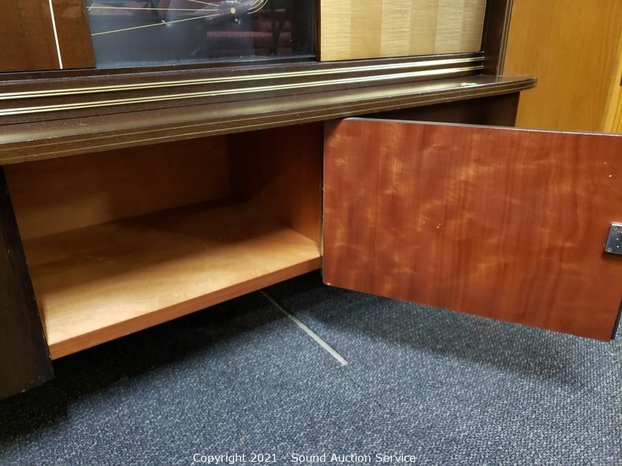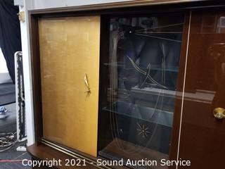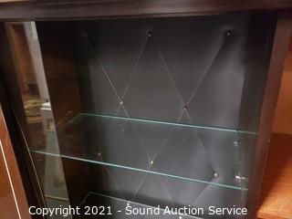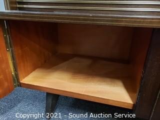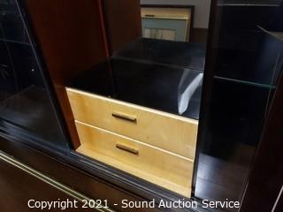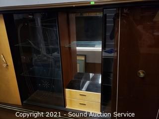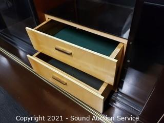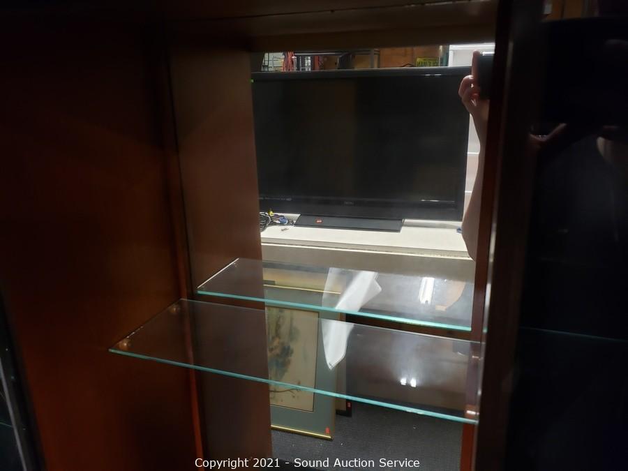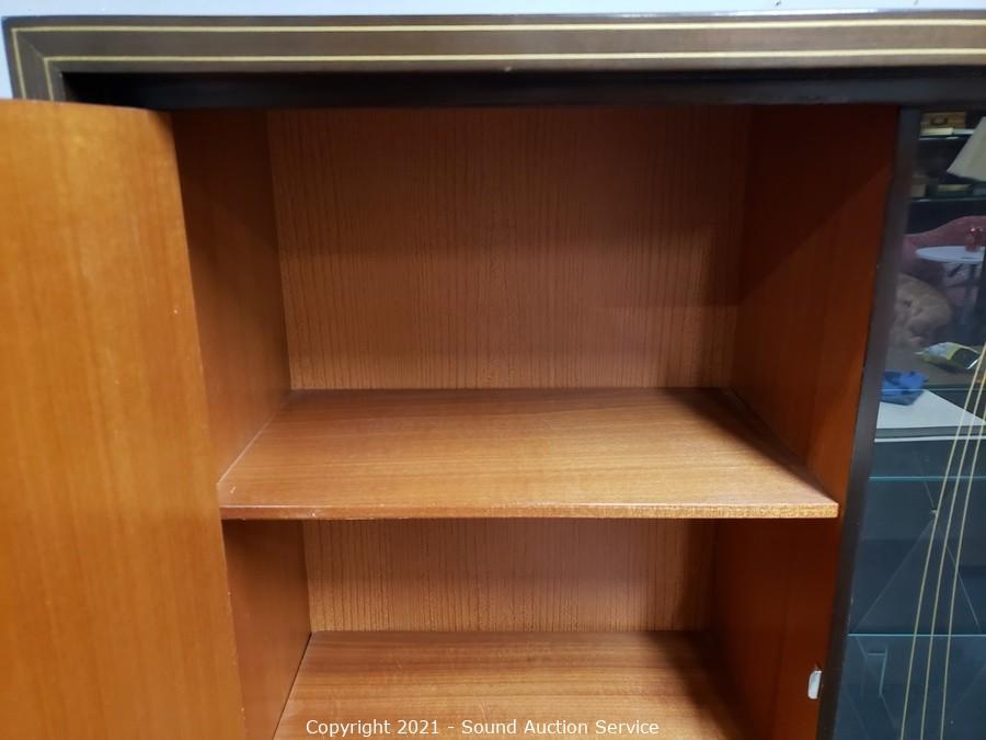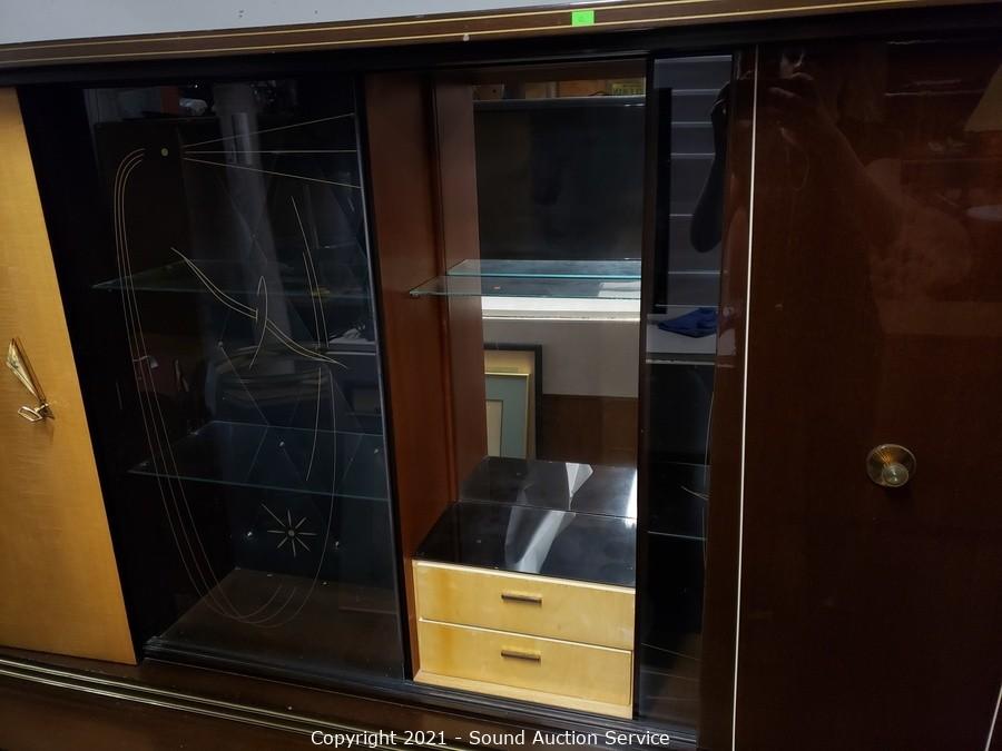 Lot Details: Glass sliding doors, center door slides to reveal a mirror and 2 felt lined drawers, glass shelves, side panels and lower cabinets are locking, come with individual keys. Some minor wear, overall excellent condition. 60.25" x 94" x 21".