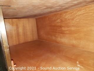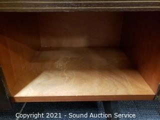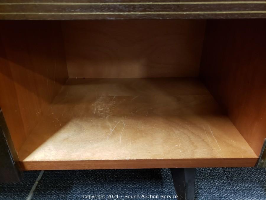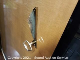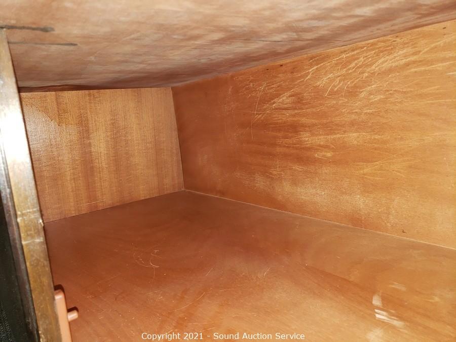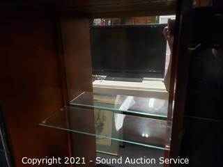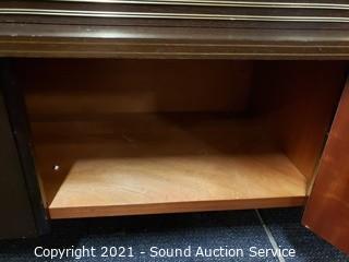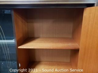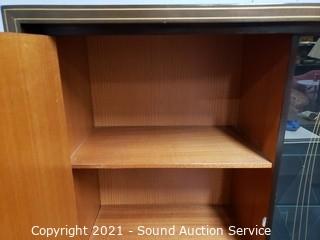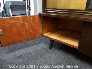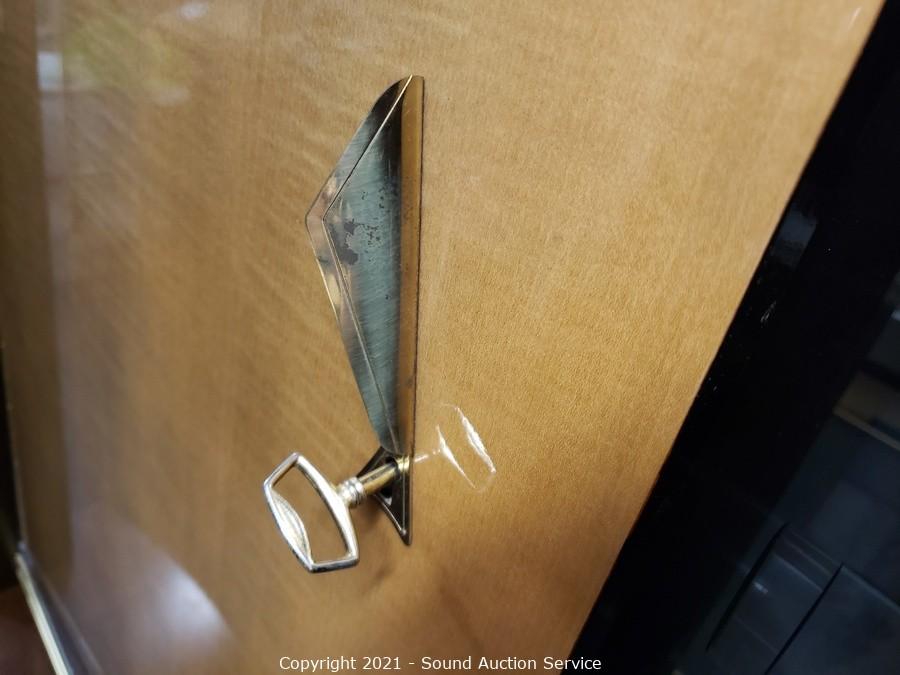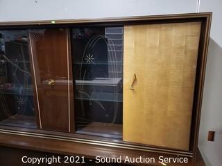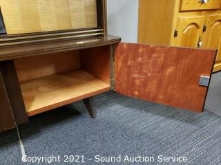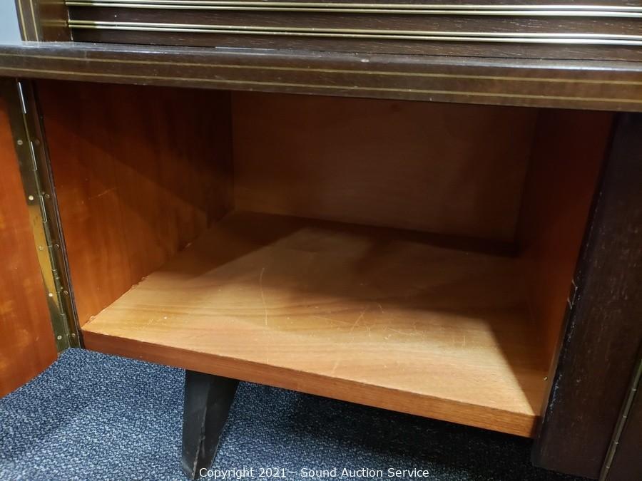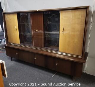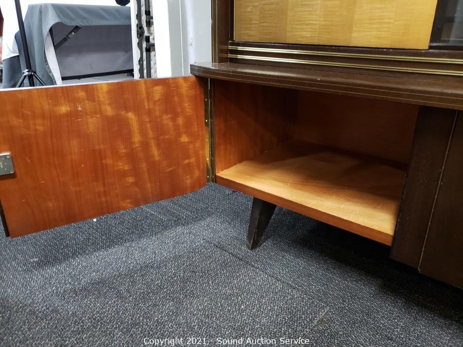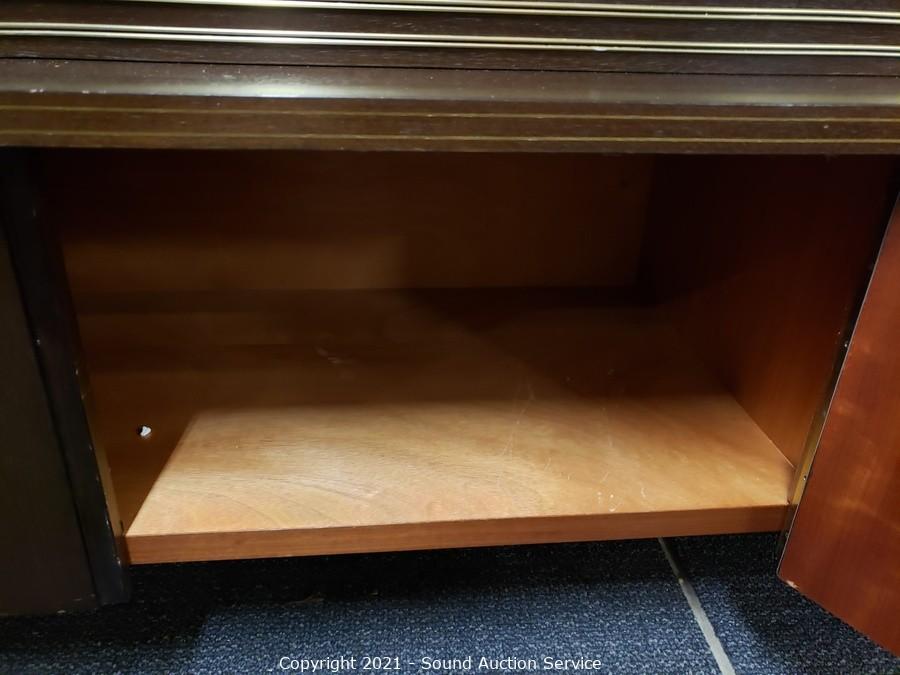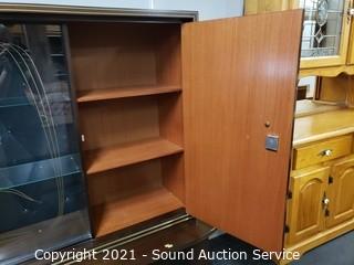 Lot Details: Glass sliding doors, center door slides to reveal a mirror and 2 felt lined drawers, glass shelves, side panels and lower cabinets are locking, come with individual keys. Some minor wear, overall excellent condition. 60.25" x 94" x 21".