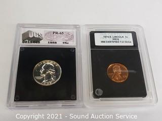 Lot Details: 1986-S Jefferson Nickel PR70CAM, 1974-S Lincoln Cent PR70, 1959 Washington Quarter PR65, 1979-P Susan B. Anthony Dollar MS70, 1985-D Jefferson Nickel MS70