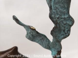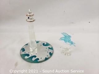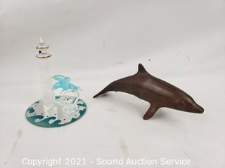 Lot Details: 2 bronze (one dolphin has come detached), 2 motion figures, art glass lighthouse & Orca sculpture. 4" to 9" tall.